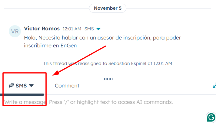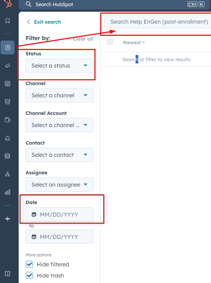 The HubSpot Inbox is the primary tool the coaching team utilizes to consolidate all incoming messages from learners who contact us via SMS. The shared inbox is titled 'Help EnGen (Post-Enrollment).